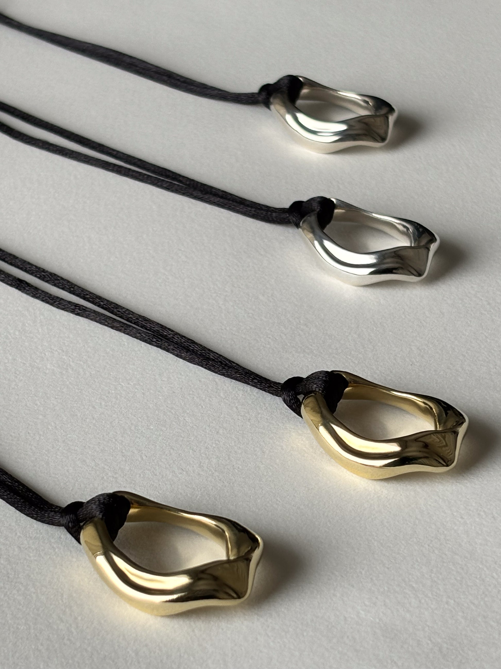 Made to order in 925 silver, suspended on a satin cord, with hand sculpted 925 silver ends.