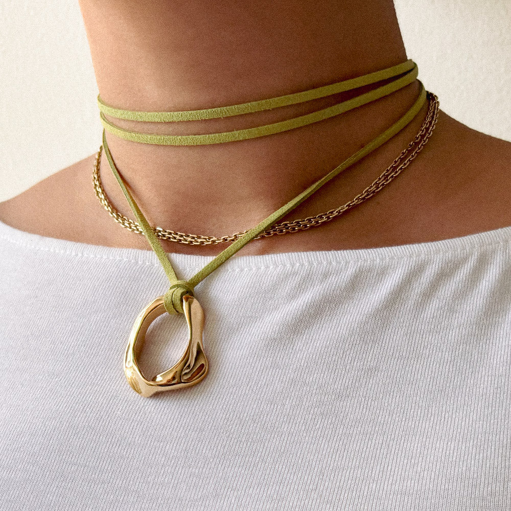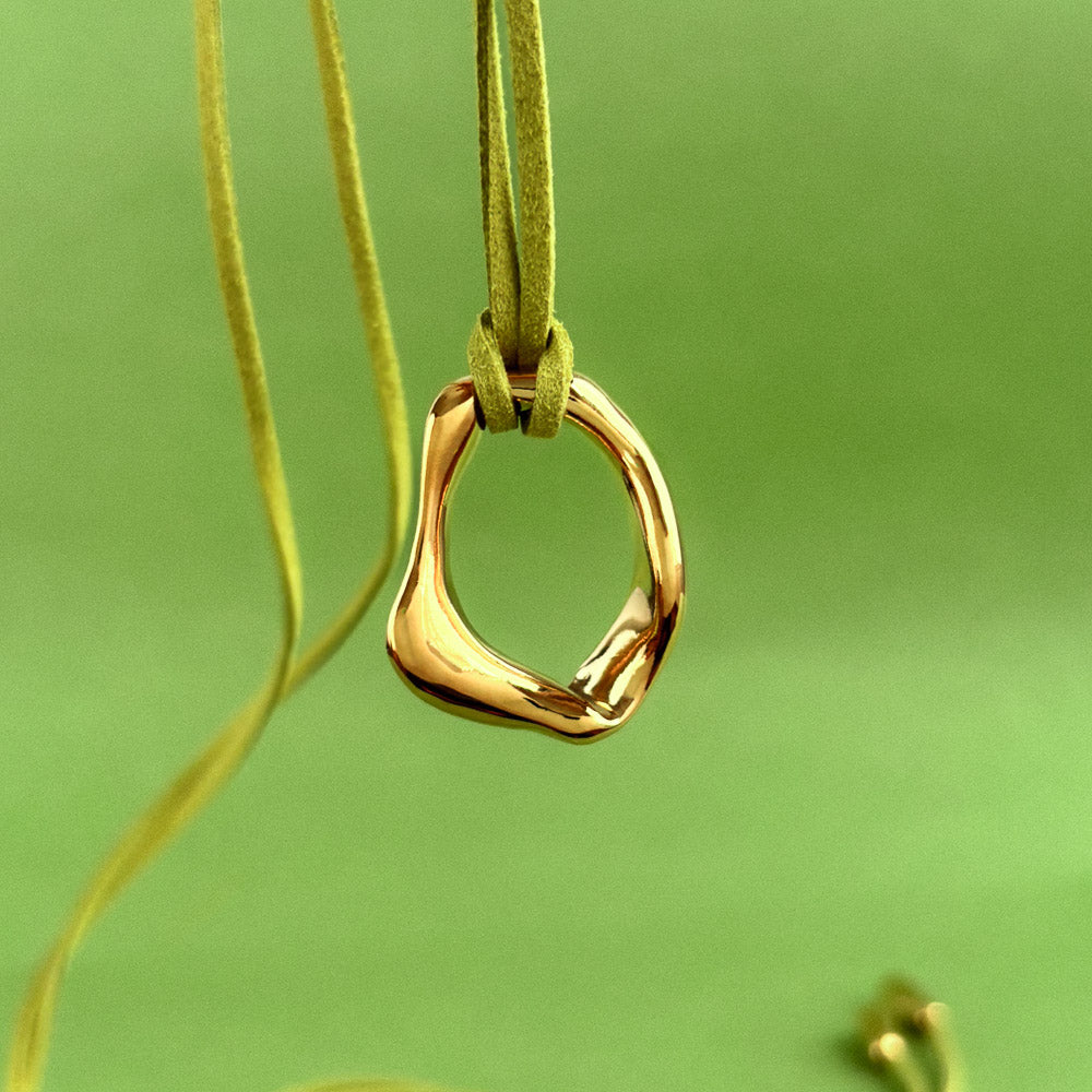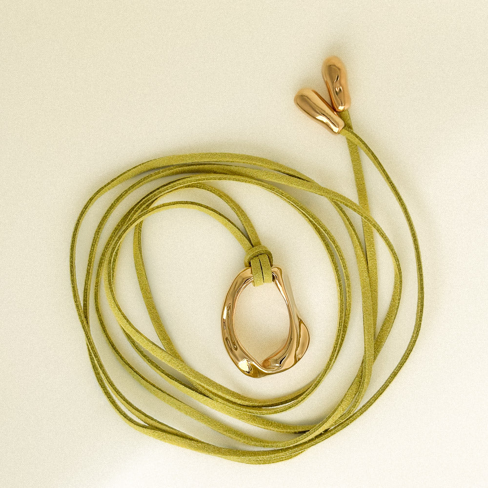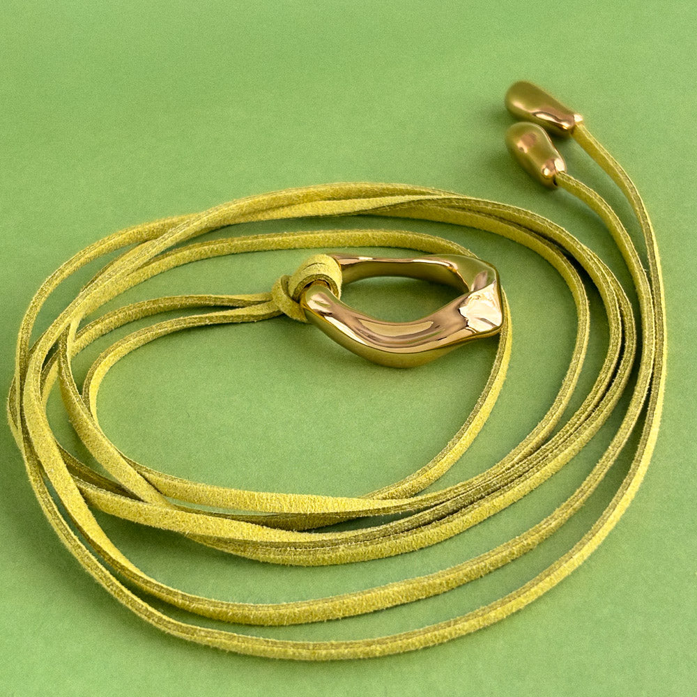 A solid brass pendant, plated with a 14k gold layer, suspended on a vegan suede cord in Meadow, a golden-green shade recalling sunlight resting on wild grass.