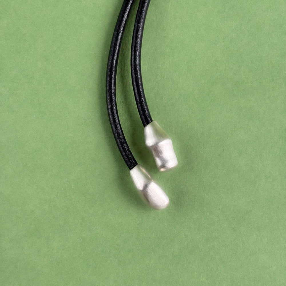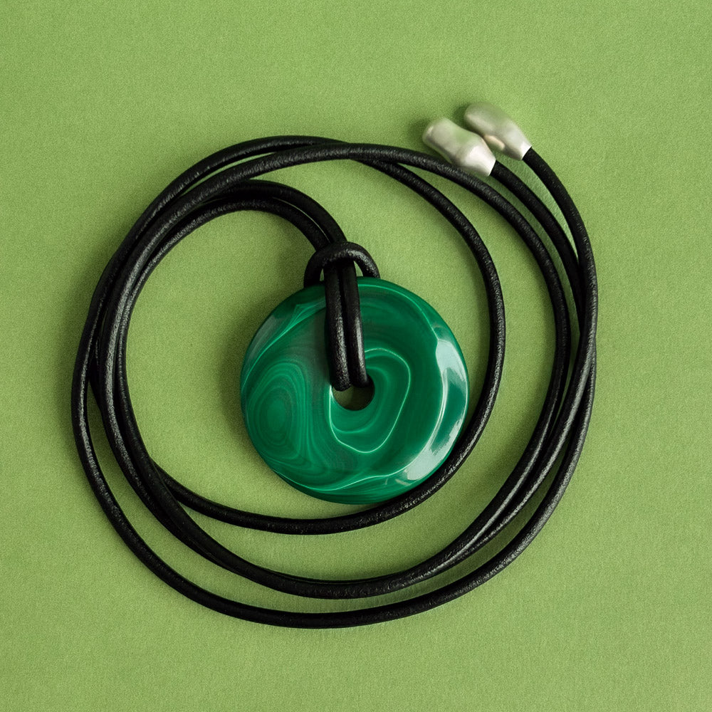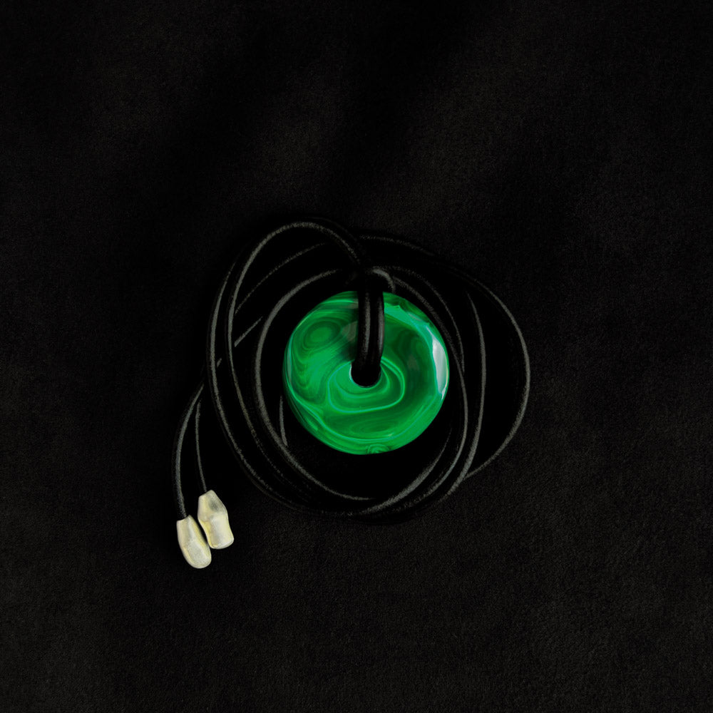 A large circular malachite, smooth and alive in its green layers, resting on a genuine leather cord. The ends are uniquely hand-sculpted in sterling silver and finished with a soft satin sheen.